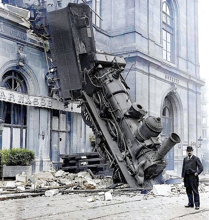 Дата: 22 октября 1895 года Обстоятельства происшествия Пассажирский поезд отправился из Гранвия в Париж. Состав состоял из 12 вагонов: - 3 багажных - 1 почтовый - 8 пассажирских По расписанию поезд должен был прибыть в Париж в 15:55, однако он задерживался. Машинист, нарушив инструкцию, решил не тормозить на уклоне, что привело к разгону состава. Начальник поезда осознал опасность ситуации и предпринял попытку экстренного торможения. Однако ранее машинист отключил тормоза Вестингауза, что сделало экстренное торможение неэффективным. За считанные минуты до прибытия машинист использовал вспомогательные и ручные тормоза, но скорость оказалась слишком высока, и тормоза не смогли остановить поезд. Последствия аварии В 16 часов паровоз на полной скорости пробил путевой упор и въехал прямо на перрон старого Западного вокзала. Затем он проехал примерно 30 метров по станции, врезался в стену здания и, разрушив её, упал с высоты 10 метров на улицу Ренн. При этом пассажирские вагоны ос