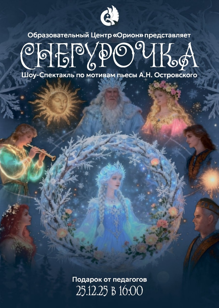 По традиции кульминацией театрального декабря станет Новогодний спектакль от преподавателей «Ориона» 🫐 25 декабря наши любимые учителя готовят грандиозное шоу-спектакль Нас ждёт постановка «Снегурочка», вдохновлённая произведением А.Н. Островского — новогодняя сказка, наполненная сюрпризами, смехом и неповторимой энергетикой 🫶 В главных ролях ☃️ Рекуненко С.А., Шатилов С.И., Джумаева А.У., Зенько В.В., Федотов И.А., Билюшко Е.В., Петров А.А., Пастухов А.А., Селицкая М.А. 🗓 25 декабря | 16:00 Не планируйте ничего на эту дату, проведём волшебный вечер вместе😉