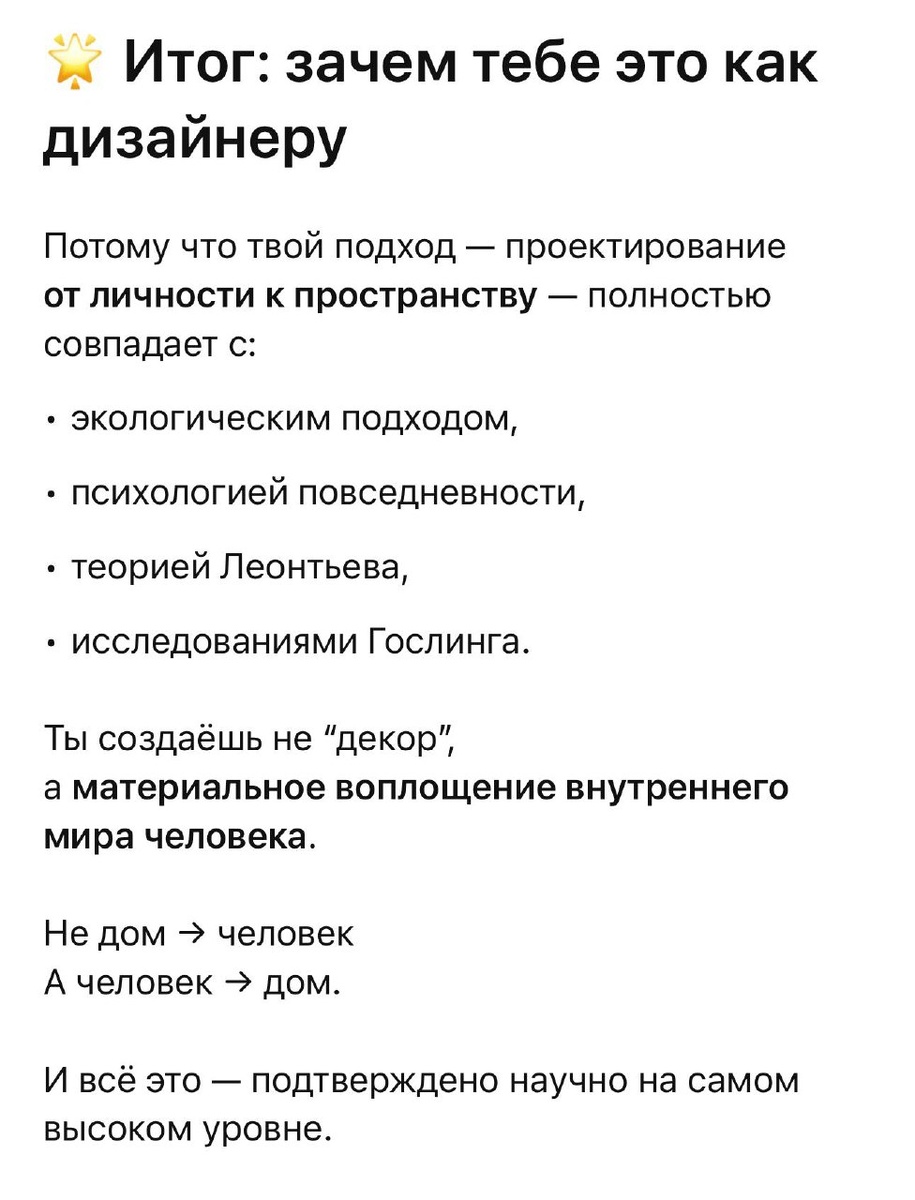 Меня GPT очень хорошо изучил. И вот я с ним читаю книгу- психологическое исследование. Там много в пример приводится теорий разных психолог, которые изучали, анализировали влияние дома, пространства жизни на человека. Прям очень интересно, очень глубоко. Все непонятное, или когда хочу объемнее, глубже я копирую и обсуждаю с GPT и он находит прямое пересечение моих выводов и подходов с научными исследованиями. Я вот всегда знала, что должны быть такие исследования, но почему-то такие труды мне никак не попадались, хотя я искала сотни раз! Но вот эта книга… Я за 4 подхода добралась до 20 страницы только. Это что-то на оргазмическом 🤩 Я сейчас буду не просто теоретизировать «мне кажется…» или «по моему опыту, по эпыту моих клиентов…» а оперировать теориями Леонтьева, исследованиями Гослинга, моделью линз Брунсвика!