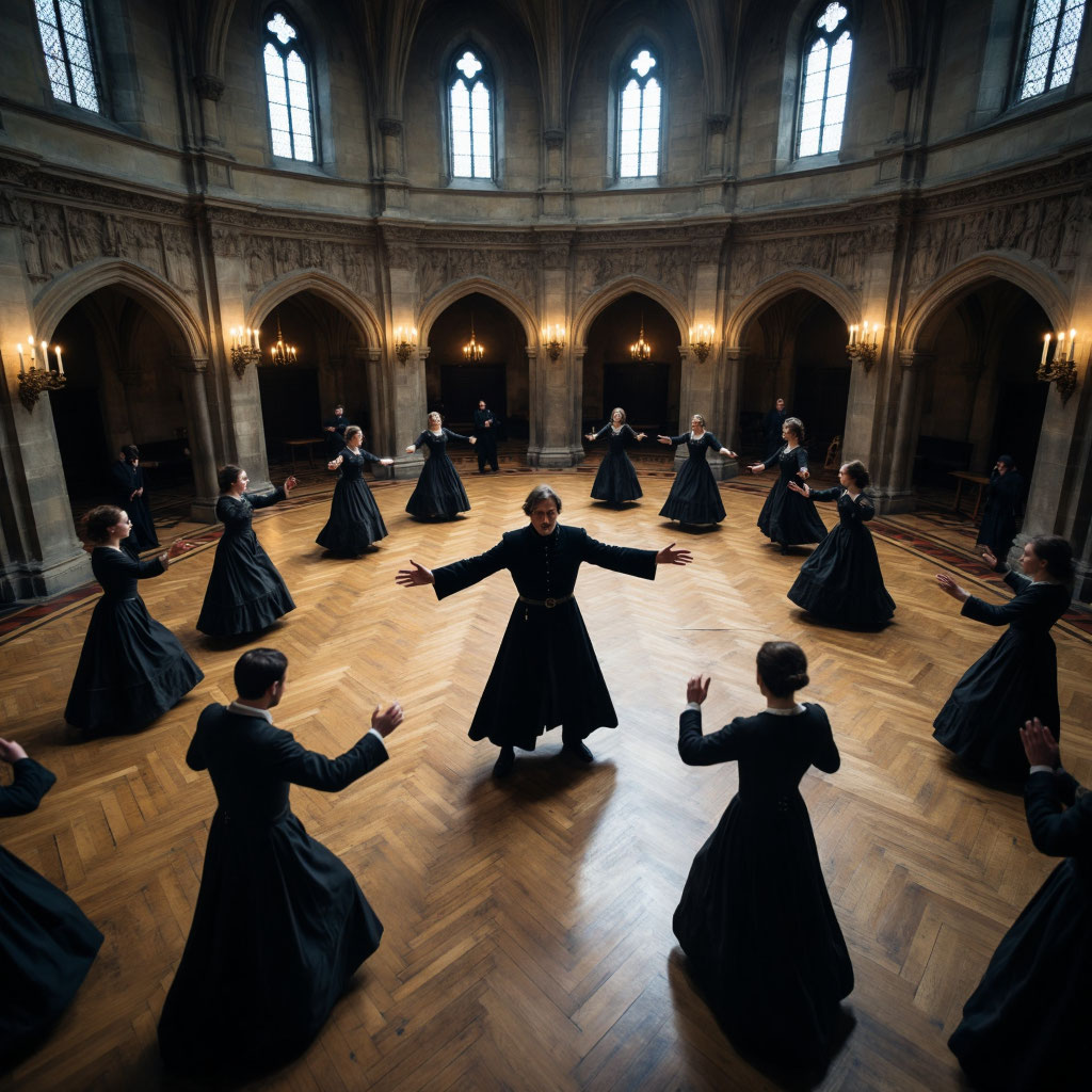 Первую ночь они провели в восточном крыле, подальше от главных покоев. И все же, ближе к полуночи, Годфри проснулся от странного ощущения. Сначала ему показалось, что это ветер. Но нет. Это была музыка. Едва уловимая, призрачная — тонкий перезвон лютни, ритмичный стук барабана, скрипки, звучащие из самой толщи стен. И под нее — топот. Множество ног, отбивающих дробный, неистовый ритм. Звук доносился снизу, из центральной части замка.