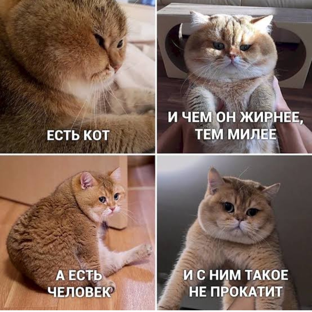 Когда повезло быть котом с пушистой костью Мистер Кот, найди обязательно, а то сосиски кончились Дело не терпит отлагательств! А вот соли меньше надо есть. Так врач говорит Не повезло, не прокатило Зато интересы совпали Зато причёска бесплатная, будет королём вечеринки Есть два типа людей 👌😀 Вокруг меня одни акционеры получается 🤔 А как вы догадались? Очень требуется, а то у нас никак ничего пропасть не может 😹 У хорошего психолога и задания интересные, прям по душе И то правда, спать ложится нужно вовремя ☝️😀 Никто и не спорит, красота — страшная сила Хорошего дня! 🌞