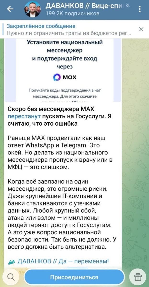 Когда-то национальный мессенджер презентовали как честного конкурента Telegram и WhatsApp. Но попытки сделать из него пропуск к врачу – это слишком. Вице-спикер Госдумы назвал это ошибкой и отметил такой подход как угрозу безопасности граждан: "Зависимость от одного мессенджера – огромные риски. Даже крупнейшие IT компании или банки сталкиваются со сбоями или утечками данных. Любая неполадка – миллионы граждан теряют доступ к Госуслугам. А это уже вопрос национальной безопасности. Это неправильно! Всегда должны быть альтернативы!", – заявил в своём Telegram-канале Владислав Даванков.