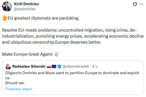 "Сделаем Европу снова великой": Кирилл Дмитриев считает, что Европа заслуживает лучшего. В посте в соцсети X глава РФПИ написал, что ЕС необходимо решить ряд проблем, в числе которых: 🔲 неконтролируемая миграция; 🔲 рост преступности; 🔲 деиндустриализация; 🔲 высокая стоимость энергоресурсов; 🔲 стремительный экономический спад; 🔲 повсеместная цензура. Пост Дмитриева стал ответом на публикацию главы МИД Польши Радослава Сикорского, в которой тот обвинил главу РФПИ и Илона Маска в желании разделить Европу для господства над ней.