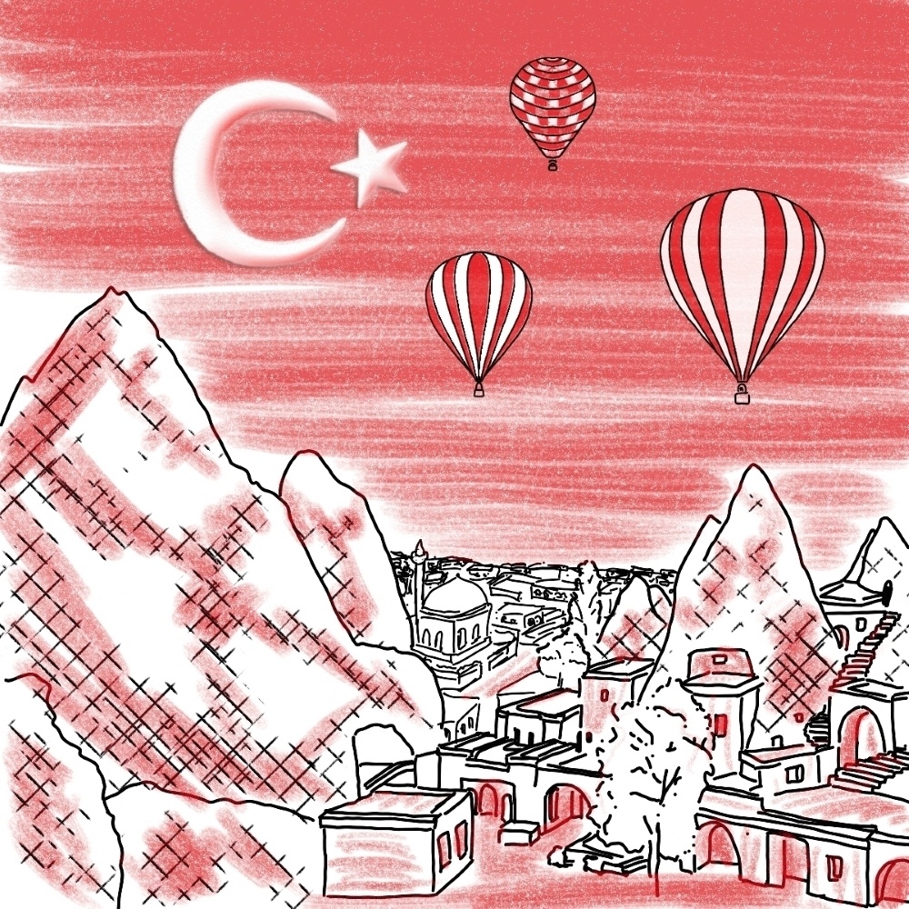 Рисовала - Маргарита Ивляева. И, если задуматься о том, какие цвета у турецкого флага, то мне кажется у автора арта получилось отлично справится с тем, как использовать монохромную палитру и отразить все, включая символы флага. Просто замечательная работа.
