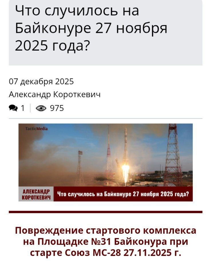 Просвещаюсь в выходные, очень хорошая статья, может, кому-то будет интересно прочитать всё в одном месте и с картинками: https://tacticmedia.ru/articles/chto-sluchilos-na-baykonure-27-noyabrya-2025-goda/ В СМИ всё как-то замолчали, а между тем это серьёзная поломка. Не критичная, но требующая ресурсов и времени. Странно, что Роскосмос молчит, как мышь под веником. #Роскосмос #космос #Байконур #старт #авария