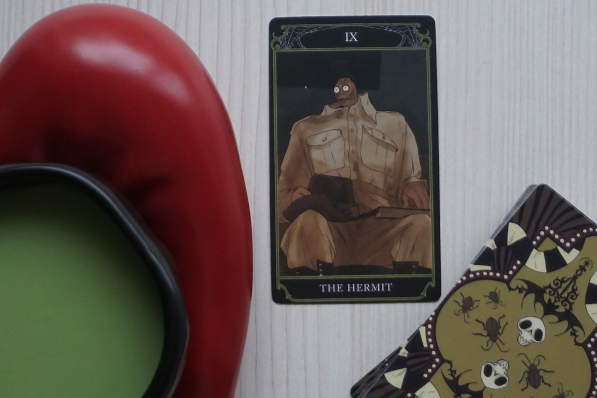 На карте челик с маленькой головой, второсортный мертвец, который ждёт своей очереди. Его поза — склонённая голова, руки, держащие шляпу, — передаёт усталость и размышление. Это отсылка к Адаму Мэйтланду, который в фильме пытается управлять домом, став призраком, но сталкивается с бессилием перед абсурдом потустороннего мира. В традиционном Таро «Отшельник» символизирует внутреннее путешествие, уединение и поиск мудрости. А вот у «Битлджуса» эта карта приобретает новый смысл: здесь одиночество — не поражение, а необходимый этап, чтобы обрести связь с собой в мире, где даже призраки теряют ориентиры.