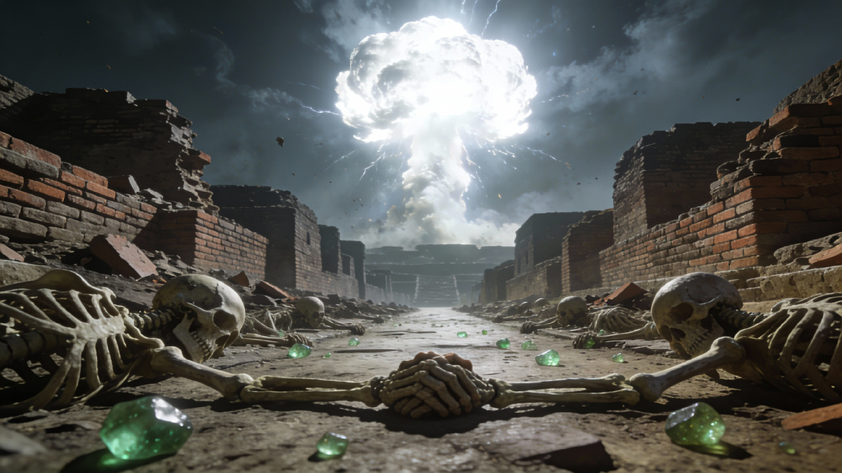 На костях нет следов холодного оружия (значит, это не набег врагов). Дикие звери не тронули тела. 2. Оплавленные камни (Зеленое стекло) Самое страшное доказательство. В эпицентре разрушений кирпичи и камни не просто разбиты — они оплавлены.