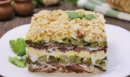 Этот салат — удачный гибрид теплой мясной закуски и сытного основного блюда. Он идеально подойдет для ужина в кругу семьи или для приема гостей, которым вы хотите устроить кулинарный сюрприз. Сочетание температур и текстур (теплое мясо, прохладный хрустящий огурец, рассыпчатые орехи) делает каждую ложку неповторимой. Ингредиенты (на 2-3 порции): Для салата: · Говядина (вырезка, филе, тонкий край) — 300 г · Соленые огурцы (бочковые) — 2-3 шт. (около 150 г) · Грецкие орехи — 70-80 г · Картофель — 2-3 шт. (средние) · Лук репчатый (лучше красный) — 1 шт. · Зелень (петрушка, кинза, укроп) — небольшой пучок · Масло растительное (для жарки) · Соль, свежемолотый черный перец Для соуса/заправки: · Сметана (20%) — 4-5 ст. л. · Горчица (дижонская или классическая русская) — 1-2 ч. л. · Рассол от огурцов — 1-2 ст. л. · Чеснок — 1 зубчик (по желанию) Пошаговый рецепт приготовления: 1. Подготовка ингредиентов. · Говядину промокните бумажным полотенцем, натрите солью и перцем. Оставьте на 1