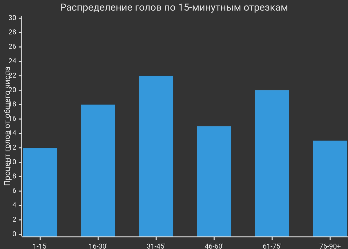 📊 Футбольная аналитика: почему второй тайм результативнее первого? Исследование 1000 матчей показывает интересные закономерности в распределении голов. Разбираемся, почему команды чаще забивают после перерыва и как визуализация данных помогает понять игру глубже. 🔍 Что говорят цифры? Проанализировав 1000 матчей топ-5 европейских лиг (АПЛ, Ла Лига, Серия А, Бундеслига, Лига 1), мы получили чёткую картину: Ключевые выводы: · Второй тайм даёт 58% всех голов · Пик результативности — 46-60 минуты (25% голов) · Наименее результативный отрезок — начало матча (1-15': 12%) 🤔 Почему так происходит? 1. Физический фактор После 45 минут игры защитники устают, концентрация снижается. Свежие ноги после перерыва против уставших защитников — идеальная формула для голевых моментов. 2. Тактические изменения Тренеры успевают проанализировать первую половину и внести коррективы. Часто это означает более атакующую схему, особенно если команда проигрывает. 3. Психологический перезапуск Матч
