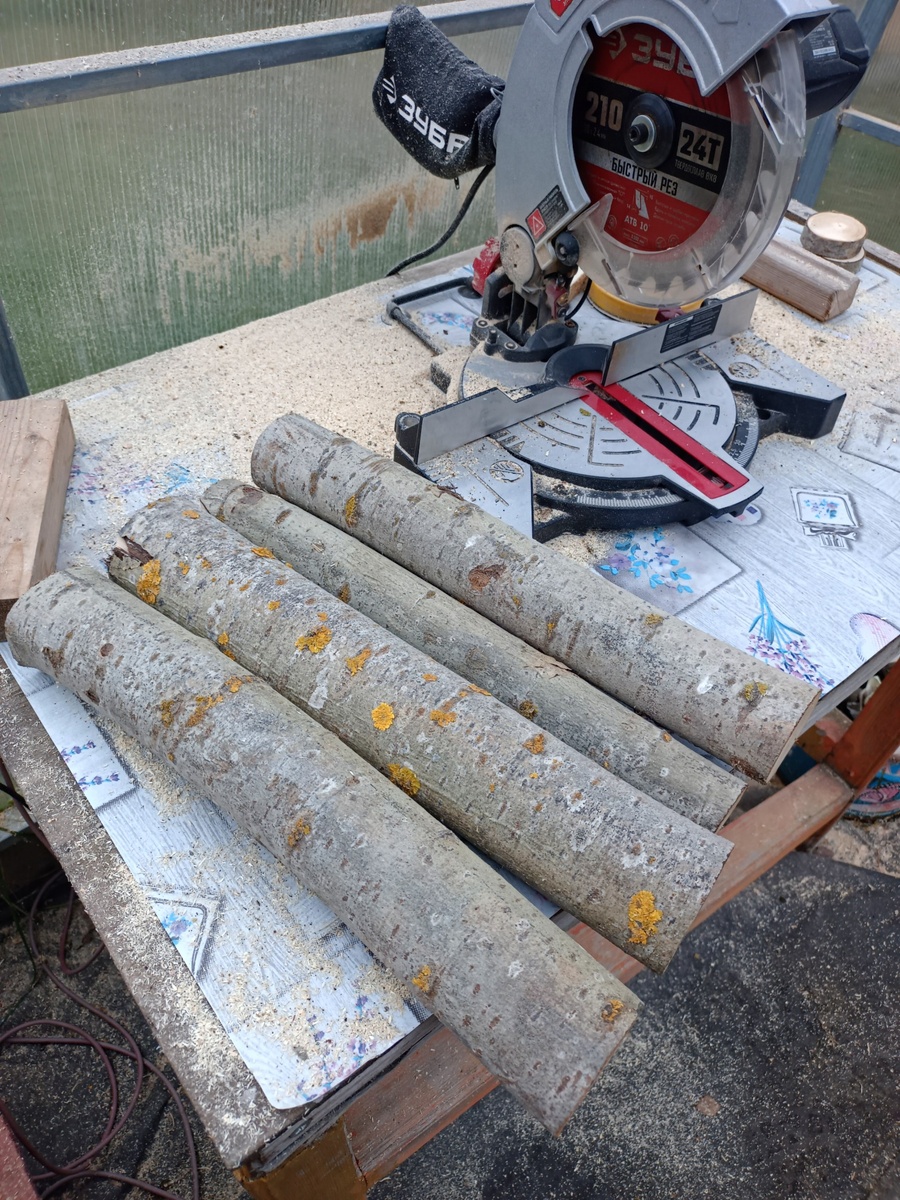 Как детали буду использовать горбыль, в две доски высотой. Столбики делаю из осины. Были стволы, сухие, распилил по 40см.
