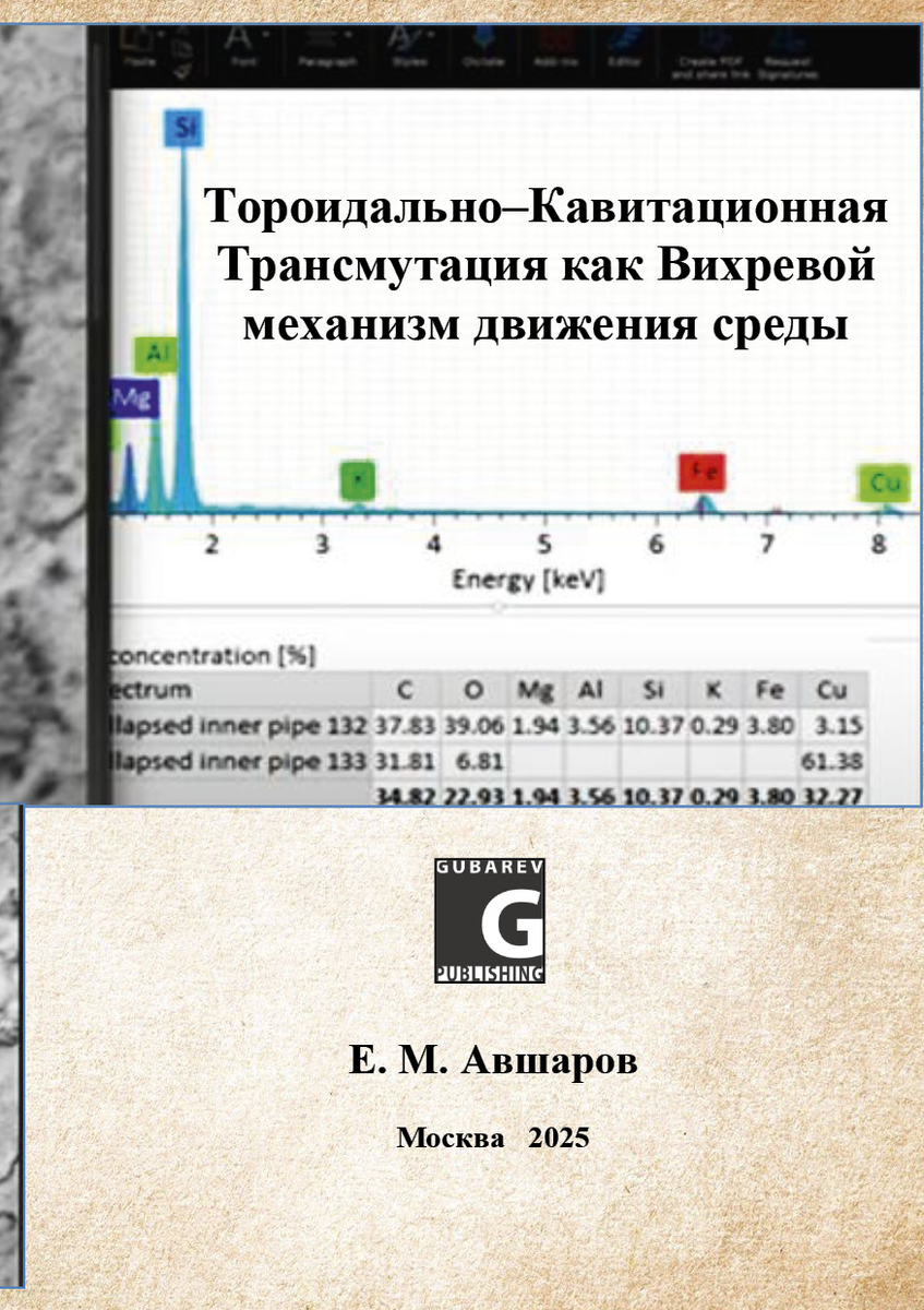 05 декабря 2025 года вышла из печати монография: "Тороидально–Кавитационная Трансмутация как Вихревой механизм движения среды". Представлена непротиворечивая модель среды “Физического Вакуума” или всепроникающего “Нового Эфира”, именуемого далее – “Эфир”, воздействующей на планеты, звезды и сами галактики в наблюдаемой нами Вселенной, – как извне на эти объекты, так и на процессы, протекающие в материальных объектах. Модель обладает свойством масштабной фрактальности и прослеживается в масштабах от Протона до самоорганизации Галактик. Представлен интегрированный подход к пониманию основного вида движения этой среды "Нового Эфира" в виде “Тороидально-Кольцевого образования со Спином-Джетом”, проявляющейся на всех масштабах Вселенной – от фемто-мира до Галактик, и являясь единственной полностью устойчивой структурой, определяемой огромной разностью давления между ее периферией и центром эфирного вихря. “Спин-Джет”, как обязательная и неотъемлемая часть Тороидально-Кольцевого эфирного