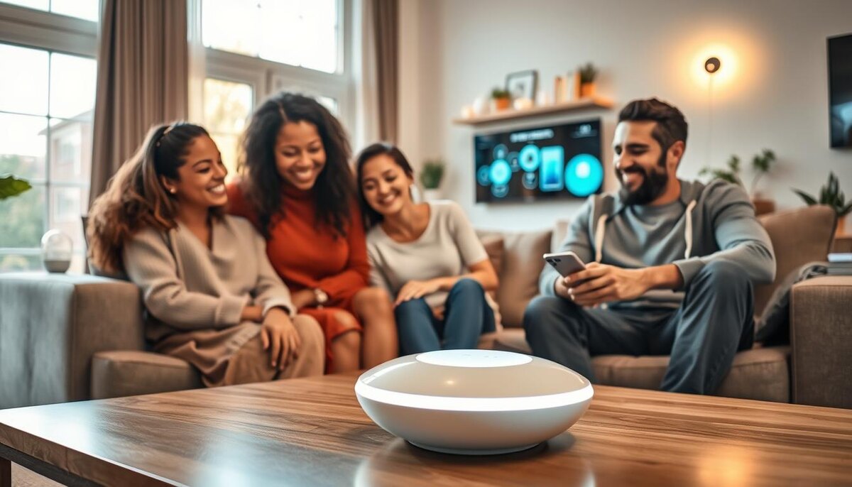A modern living room filled with the latest smart home technologies, showcasing the integration of artificial intelligence in daily life. In the foreground, a family of four—two adults in professional business attire and two children in casual clothing—interacts with a large smart screen displaying home automation controls. In the middle ground, an AI-assisted robot vacuum quietly glides across the floor while smart speakers light up with soft blue ambient lighting. The background features large windows allowing natural light to flood in, illuminating sleek furniture and green plants, creating a welcoming atmosphere. The image should have a warm, inviting mood, with a focus on the harmony between technology and family life. Capture this scene from a slight angle to enhance depth, with a shallow depth of field to softly blur the background.