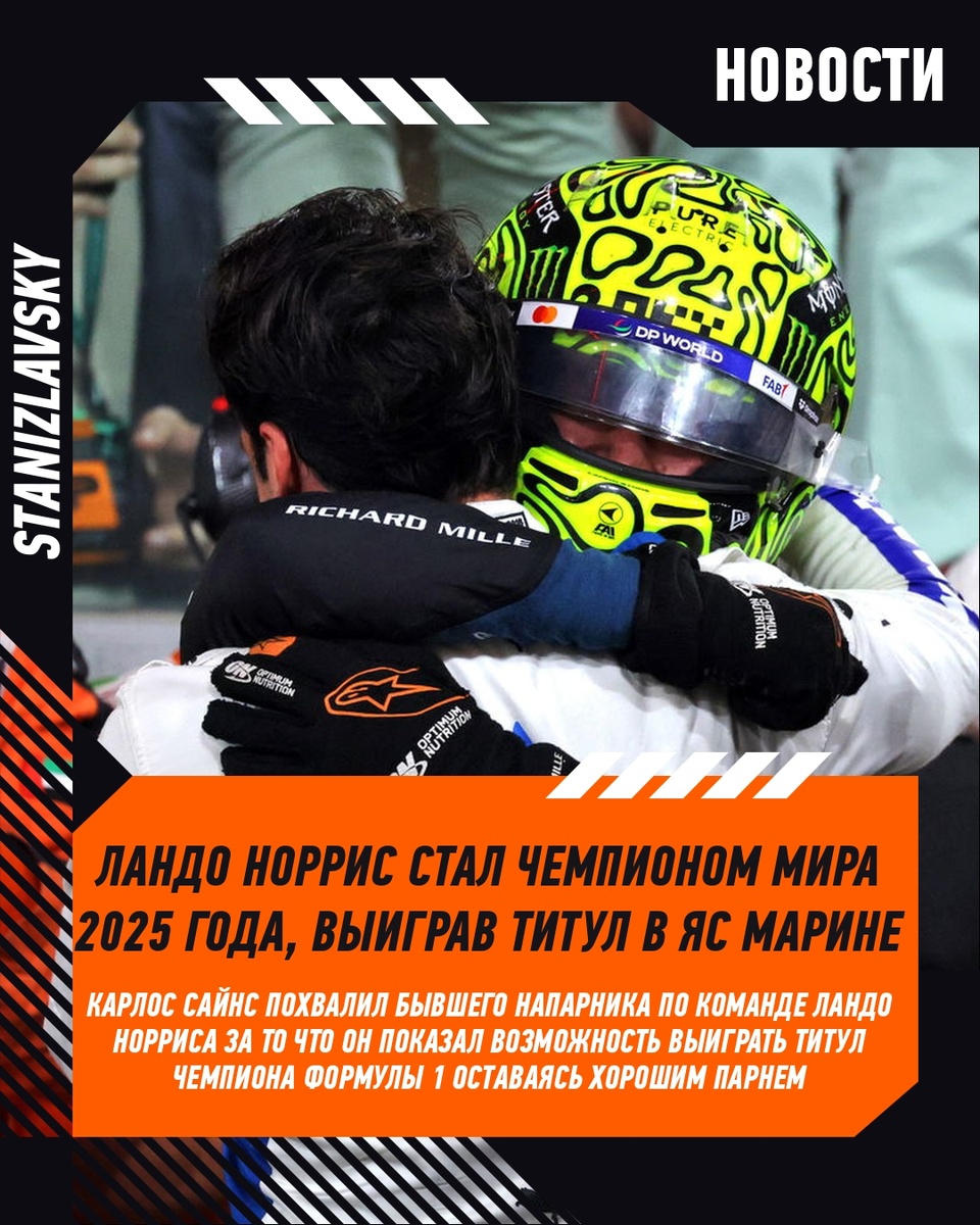 🏆 Карлос Сайнс похвалил Ландо Норриса за его победу, отметив, что тот «остаётся самим собой», несмотря на критику извне. «Очень рад за него как за гонщика, потому что он всегда был чрезвычайно быстрым, быстрее, чем ему приписывают, невероятно талантливым. В первые годы в McLaren я видел парня, у которого была скорость, чтобы стать многократным чемпионом мира. По пути он сильно развил свои навыки — и теперь он чемпион мира». 🌟 «Но больше всего я рад за него как за человека. Он не соответствует стереотипам чемпиона: всегда оставался верен себе, был честен, открыто говорил о своих трудностях и доказал, что можно стать чемпионом, оставаясь хорошим парнем — без жестокости или показного хладнокровия. Надеюсь, он останется таким же — или даже станет ещё расслабленнее и начнёт получать больше удовольствия от Формулы-1». 🏁 Сайнс отметил, что Норрису пришлось столкнуться с серьёзным давлением: «Должно быть, он немного страдал в этом году от давления соцсетей и журналистов, особенно когда ег