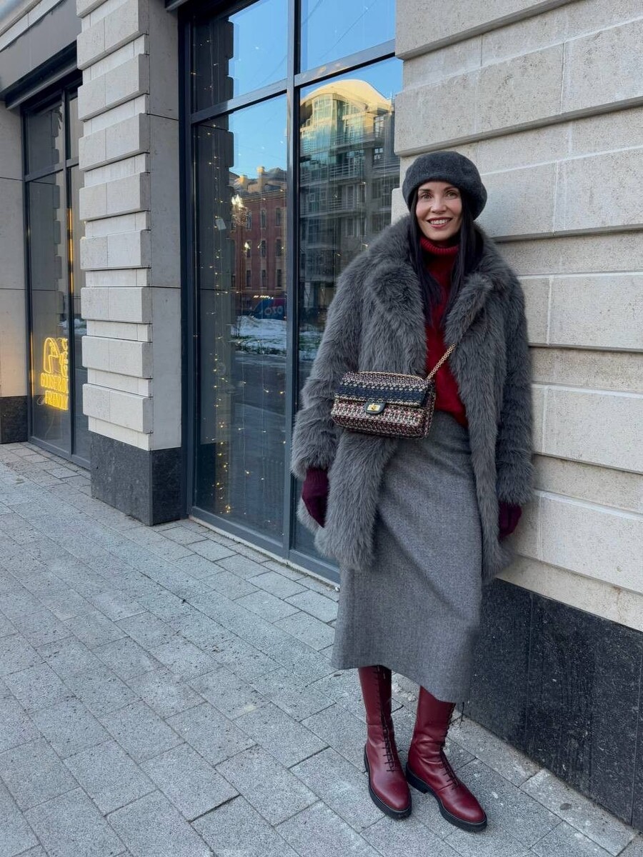 Верхняя одежда – предмет гардероба далеко не утилитарный. Пальто, куртки и шубы в современном мире призваны дополнять стильные образы и делать модниц любого возраста яркими, эффектными и оригинальными. Ну и, конечно, обеспечивать им комфорт в самое холодное время года. 10 образов для женщин 50+ 1. Стильное сочетание теплого свитера вишневого оттенка и жемчужно-серой юбки прямого кроя с темно-серой пушистой шубой длиной чуть ниже середины бедра и еще более темного вязаного берета, является очень ярким и эффектным. Отдельные – контрастные и сочные нотки образа – темно-бордовые перчатки и насыщенно-бордовые высокие кожаные сапоги. 2. Приглушенно-розовый лонгслив, а также сочетающиеся с ним по оттенку короткий меховой шарф и теплые перчатки, отлично оттеняют и делают более свежим сдержанный серо-коричневый костюм из юбки-миди А-силуэта и оригинального удлиненного жакета без воротника. Яркой деталью образа помимо предметов гардероба розового цвета станут шоколадно-коричневые сапоги с квадр