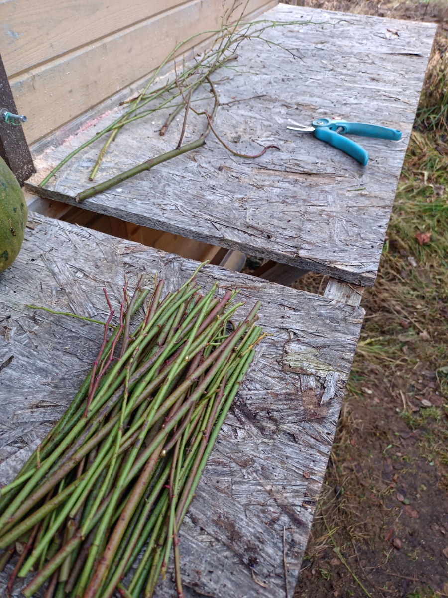 Там где траншеи копал розы плетистые растут. Уже лет 15, но цветков ни раз не видал. Посрезал плетья. И по 25см нарезал живые. Запакую и в холодильник. Ближе к весне поставлю в банку с водой. Кто даст корни — тот будет высажен, вдоль забора. Даже 1% если получится — это хорошо.