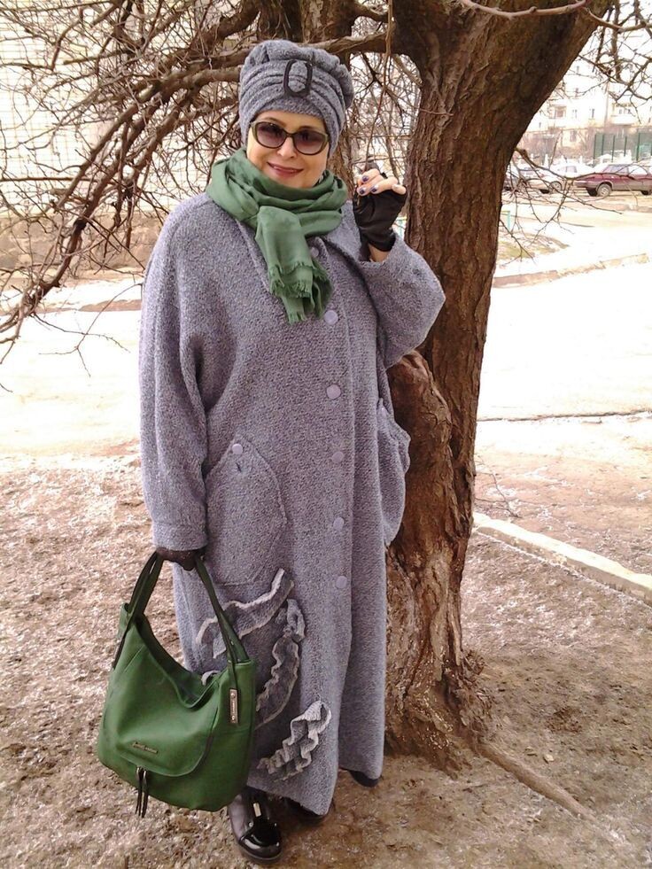 Дамы за 60 заслуживают того, чтобы быть замеченными – они могут одеваться стильно, ярко и оригинально, подчеркивая свою привлекательность и выражая неординарный вкус. В холодное время года в этом поможет верхняя одежда, которая для зрелых модниц представлена самыми разнообразными по цветовой гамме и фасонам моделями. 7 примеров для зрелых женщин 1. Оригинального кроя и сдержанного серого оттенка вязаное пальто с крупными накладными асимметричными карманами и декоративными кружевными элементами – интересная и эффектная модель верхней одежды. По цвету такое пальто грамотно дополнит вязаная шапка-«чалма», а контрастный элемент в образ внесут приглушенно-зеленые аксессуары – уложенный красивым узлом шарф и достаточно объемная сумка. 2. Свободное пальто в оригинально выполненный светло-серый и жемчужный растительно-цветочный принт подойдет женщине неординарной, имеющей свой стиль и класс. С помощью такой верхней одежды можно создать эффектный образ, если дополнить ее черной фетровой шляпой