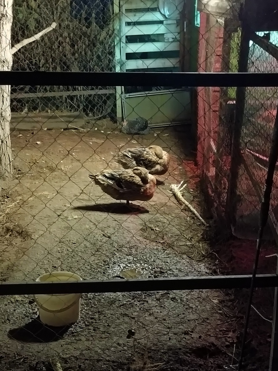 Утки странные. Наотрез отказались идти в свой домик. Поближе "к народу", в загон Стёпки сами и зашли и выходить не хотели. Тут и спят. Странные. Ну ладно, спокойной ночи! Всем!