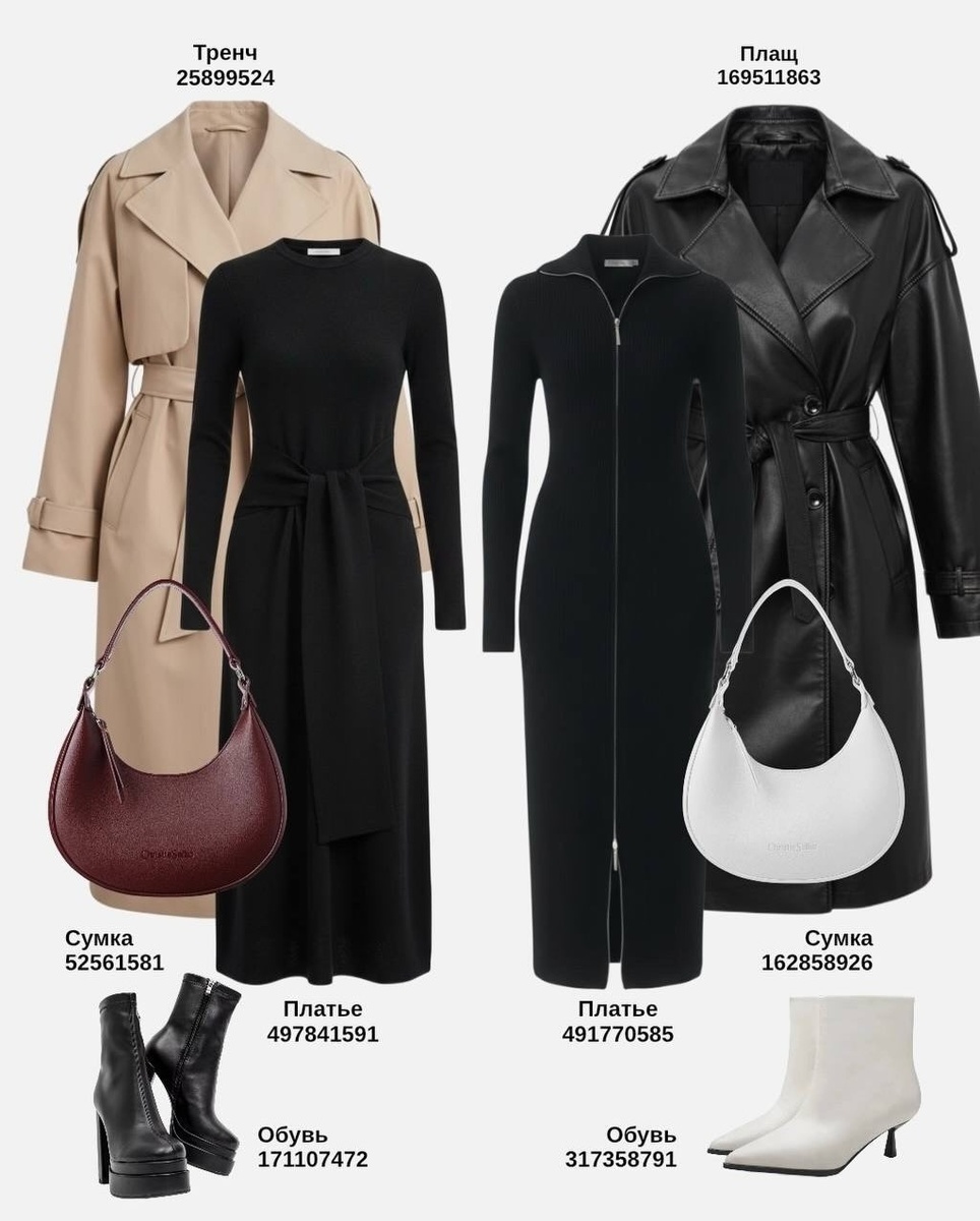 Каждый из представленных образов — это гармония цвета, формы и фактуры. Мягкие силуэты трикотажа, строгие линии верхней одежды, выразительные аксессуары — всё это создаёт стиль, который легко адаптировать под повседневную жизнь. Такие комплекты подойдут и для офиса, и для прогулок, и для особых мероприятий, подчёркивая вашу женственность, уверенность и вкус.