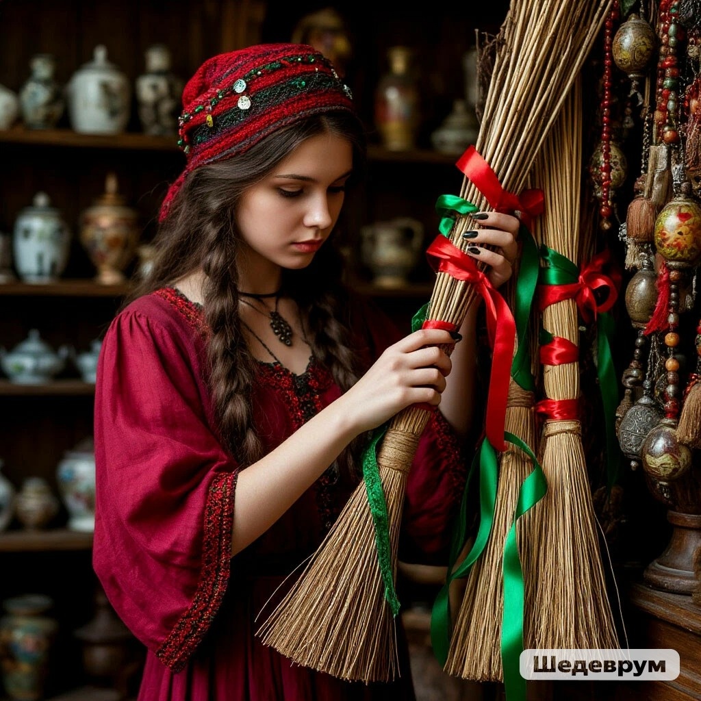 Закончив с протиранием пыли, уборщица взялась за веник. Неожиданно этот бытовой предмет обратил на себя внимание юной ведьмы: веник был красивый, как будто декоративный: пушистый, перевитый цветными шнурами, его место было скорее в сувенирной лавке, чем в руках уборщицы, в качестве утилитарного предмета.
