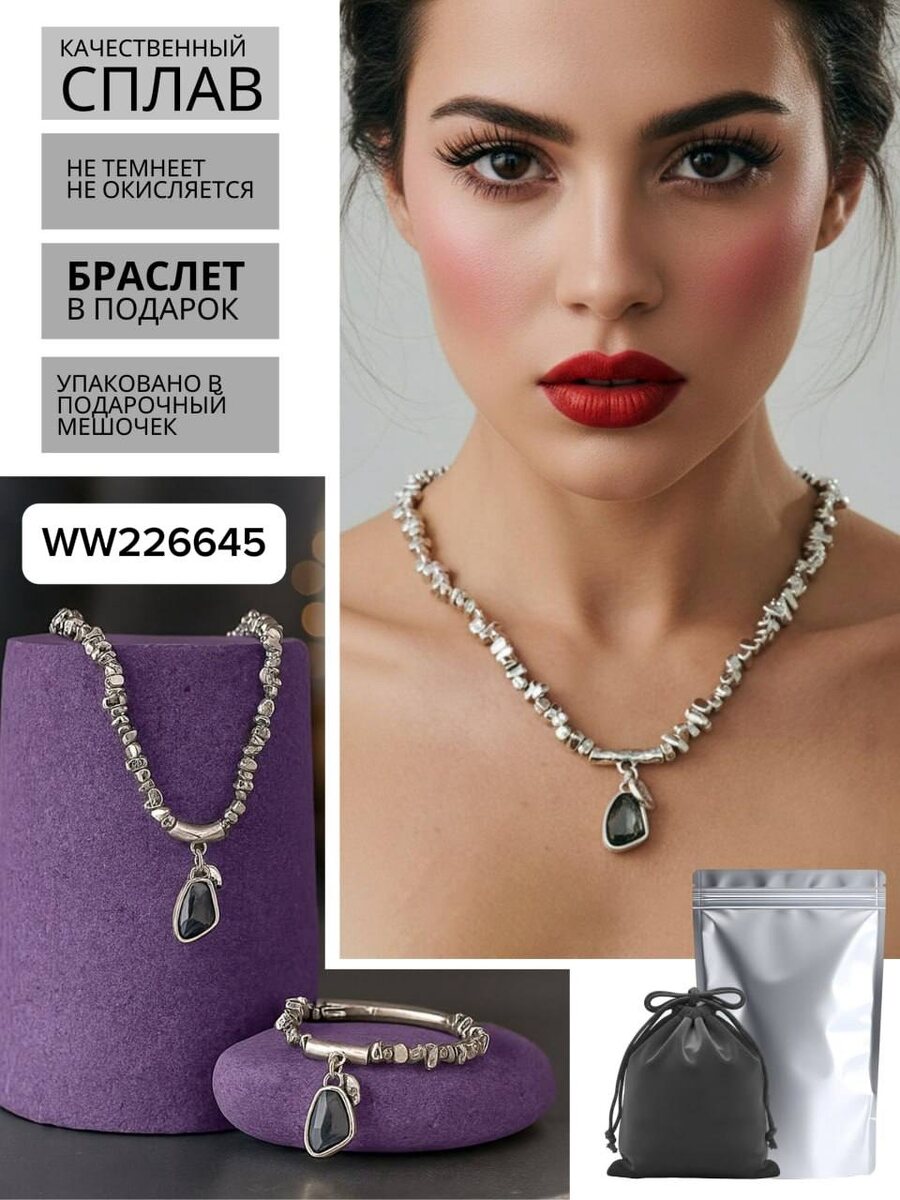 Перед вами утончённый комплект из колье и браслета, выполнено из качественного ювелирного сплава, напоминает натуральный гематит — камня, известного своей благородной матовостью, глубиной оттенка и удивительной лёгкостью. Несмотря на выразительный вид, украшения действительно невесомые, мягко ложатся по линии шеи и запястья, не утяжеляя образ.