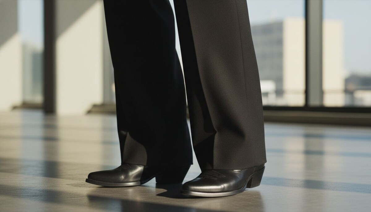 Вестерн-ботильоны с острым носом-лучшие друзья широких, струящихся брюк. Когда речь идет о трендовых широких брюках, особенно с низкой посадкой, которые вернулись к нам в этом сезоне (читайте о них в статье «Триумф Бедер: Почему Низкая Посадка Вернулась»), правильная обувь критически важна. Ботильоны должны быть достаточно узкими в голенище, чтобы легко уходить под ткань, и достаточно острыми, чтобы «выглядывать» из-под подола, создавая чистую вертикальную линию. Это создает эффект легкости и удлинения ног, который так необходим при работе с горизонтальными объемами широких штанин. Позвольте брюкам слегка собираться над обувью-это и есть та самая строгая небрежность, которую мы ищем.
