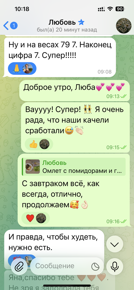 Друзья, хочу поделиться радостью🥰 У нас с моей подопечной, Любой, сегодня маленькая, но для нас большая победа! Весы наконец-то показали 79 (с копейками) кг💃 Да, мы наконец-то увидели цифру «7»! Итого – минус 5 кг! И это результат дисциплины, спокойной ежедневной рутины и готовности доверять процессу. И для меня, как для специалиста по коррекции веса, наш результат – это огромное удовольствие и мотивация для работы☺️ В такой день настроение, конечно, великолепное, вдохновляющее ✨Весь день хожу, улыбаюсь😊 У нас в Ухте сегодня – минус 22🥶❄️Фото автора Ну и традиционно — мои сегодняшние тарелочки, потому что питание специалиста должно быть таким же осознанным, как и питание клиентов😉 Хотя, уверяю вас, это не всегда так🤓 ✅ На завтрак у меня был «счастливый омлет» — белок + полезные жиры + овощи. Он даёт стабильную энергию на весь день и не провоцирует скачки аппетита. Мой завтрак. Счастливый омлет☀️ Фото автора ✅ А на обед — домашняя запеканка из картофеля и куриного фарша, оче