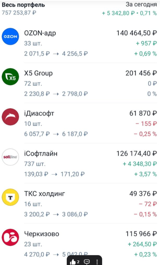 Так же в портфеле по прежнему остаются замороженные активы, это фонды Финекс, ТКС, а так же одна акция Freedom Holding. Суммарно замороженных активов где-то на 30 тысяч рублей. Правда оцениваются они сейчас очень дёшево, потому продавать я их не собираюсь.