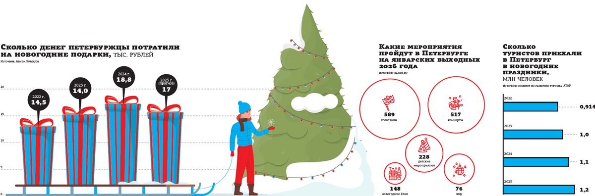 "Среди самых дорогих событий — “Новогодняя Диснеевская ёлка”, ёлка “Новый год в Изумрудном городе”, разные постановки “Щелкунчика”, спектакль “Обломов” в Александринке и камерный иммерсивный спектакль “Убийственный вечер в отеле Majestic”", — поделился Барсуков.