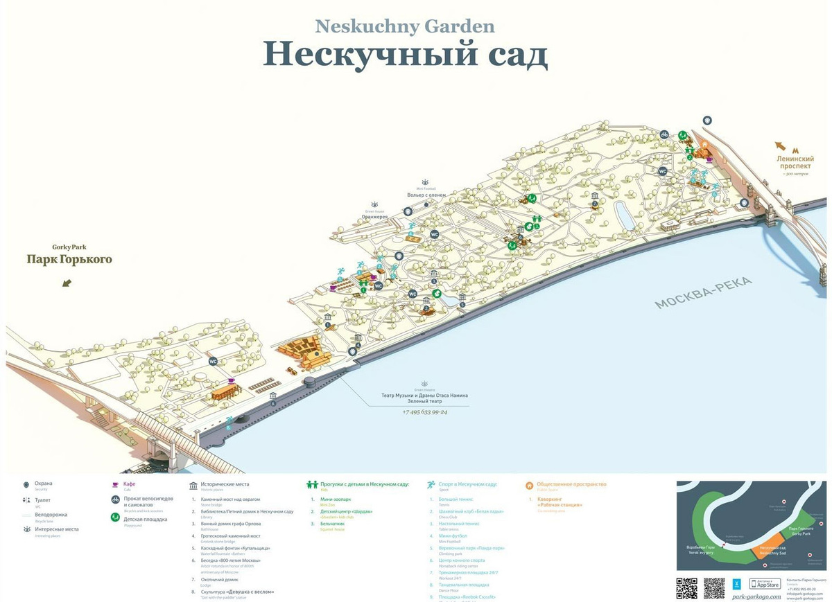 Нескучный сад — один из самых старых парков столицы. Когда-то это была территория частных усадеб, и даже сейчас атмосфера сохраняется: тихие дорожки, старые деревья, переходы между уровнями. Многие владельцы собак любят приходить сюда утром: слышно пение птиц, а сам парк кажется почти деревенским.
