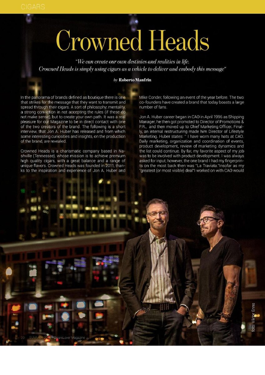 Перевод статьи из журнала CigarsLover Magazine за 2018 год «Мы можем сами создавать свою судьбу и реальность в жизни. Crowned Heads просто использует сигары как средство передачи и воплощения этого послания» Автор: Роберто Манфрин На панораме брендов, определяемых как бутиковые, есть один, который поражает посланием, которое его создатели хотят передать и распространить через свои сигары. Своего рода философия, образ мышления, твердое убеждение в том, чтобы не принимать правила (если они не имеют смысла), а создавать свой собственный путь. Нашему журналу было настоящим удовольствием пообщаться напрямую с одним из двух создателей бренда. Далее следует краткое интервью, которое дал Джон А. Хубер и в котором раскрываются некоторые интересные детали и идеи о производстве бренда. Crowned Heads — харизматичная компания из Нэшвилла (Теннесси), чья миссия — создание премиальных сигар высочайшего качества, с прекрасным балансом и спектром уникальных вкусов. Crowned Heads была основана в 2011 го