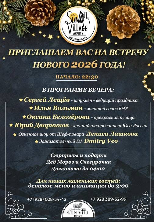 Скоро,скоро Новый год!🎄 🎅 🤶 🎄 Приглашаем встретить Новый год в парк-отеле SUN VILLAGE Arkhyz 4*🎄 Насладитесь уютом, вкусной кухней и активным отдыхом. 🎉 Программа на праздники: - 31/1 Новогодний ужин с музыкальной программой до утра 🕺☃️💃 - Развлечения для всей семьи каждый день и вечер - Лыжи, сноуборд -ежедневная заброска в горы 😉 - Конные прогулки, снегоходы, прогулки и ски туринг - Баня и бассейн, кедровая бочка, соляная комната, медицинский массаж Какой Новый год без новых впечатлений 📞 Забронируйте отдых уже сегодня! санвилладж.рф