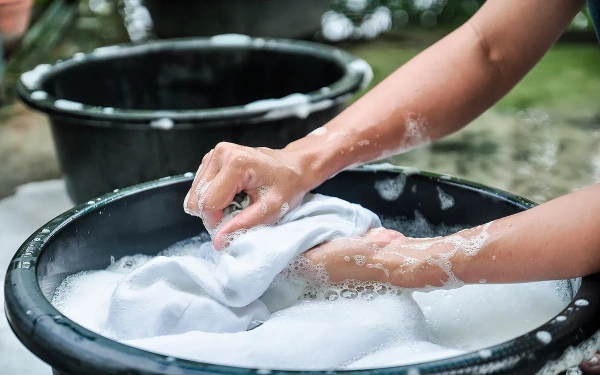 - Замочить вещь в тёплой воде с небольшим количеством порошка или геля на 30–40 минут.