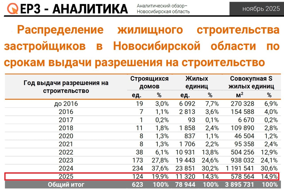 ☄️ Жилищное строительство Новосибирской области развивается за счет старых заделов. По данным аналитического обзора ЕРЗ за ноябрь 2025 года, подготовленного Институтом развития строительной отрасли, менее 15% проектов в Новосибирской области имеют разрешения на строительство, полученное в этом году. В ноябрьском отчете за 2022 год площадь таких проектов составляла 25,8%. В отчете за 2023 год – 28,4%, в 2024 году, соответственно, 20,9%. ❗️В данный момент строительная отрасль съедает заделы, подготовленные прошлыми управленческими командами региона. В разрешениях на строительство, размещенных на сайтах УАСИ за последний месяц, лишь менее 10% проектов имеют дату от 2025 года — это в два раза меньше, чем домов с первоначальной датой 10-летней давности. Например, у дома на ул. Связистов, продлевается разрешение, выданное в ноябре 2006 года. Из новых проектов этого года могу отметить ✔️ City Towers от SG Development ✔️ проект «Счастливый квартал» от ГК «Камея» ✔️Квартал «Ща» от компа