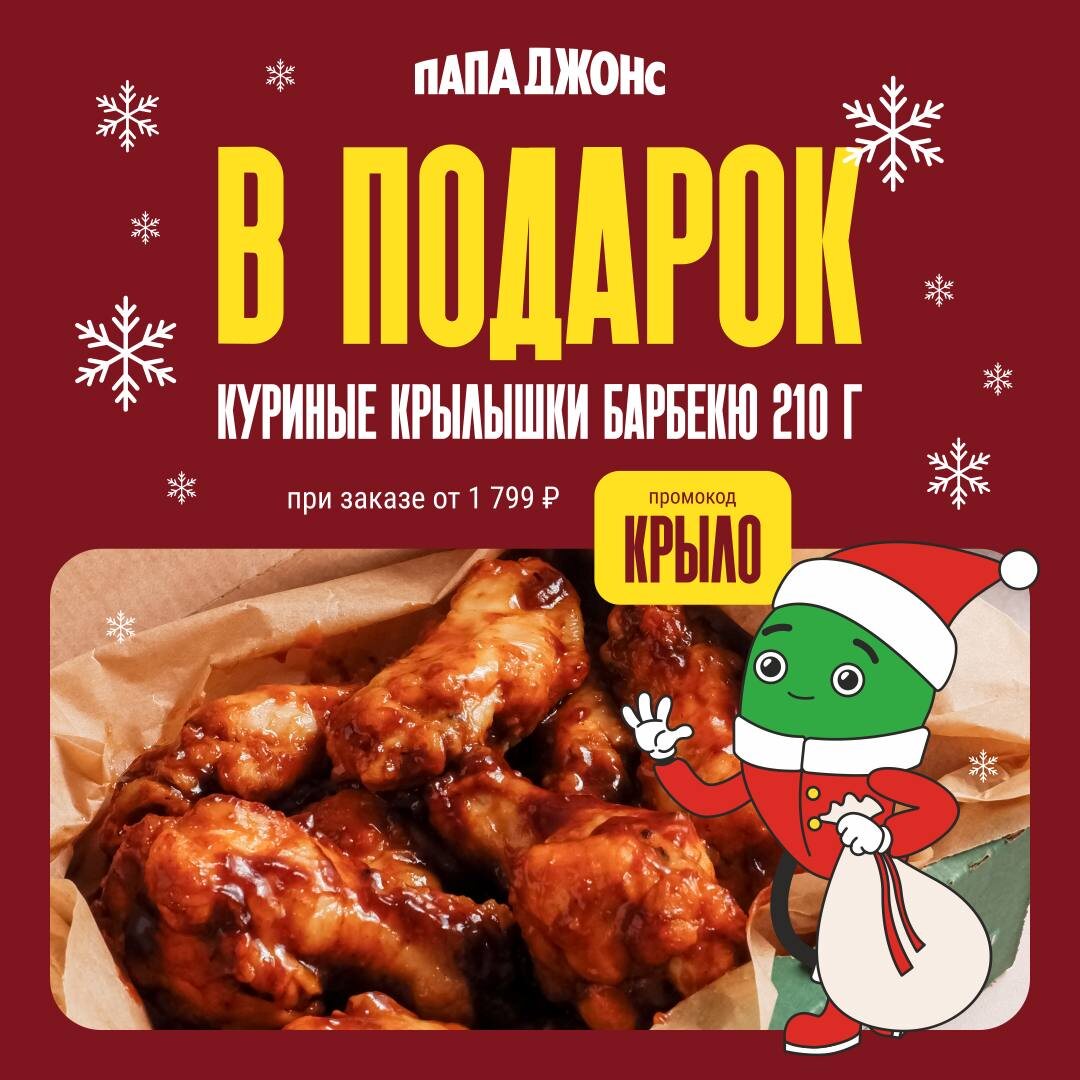 🎁 В ПОДАРОК — КУРИНЫЕ КРЫЛЫШКИ БАРБЕКЮ 🤤 С 8 по 11 декабря Дарим сочные куриные крылышки барбекю при заказе от 1 799 ₽ 🔥 👉 Просто введи промокод КРЫЛО — и подарок добавится к заказу автоматически ⏳ Акция действует ограниченное время. Идеально к пицце. Идеально к выходным Папа Джонс — лучшее к столу 🍕❤️ papajohns.ru/novosibirsk
