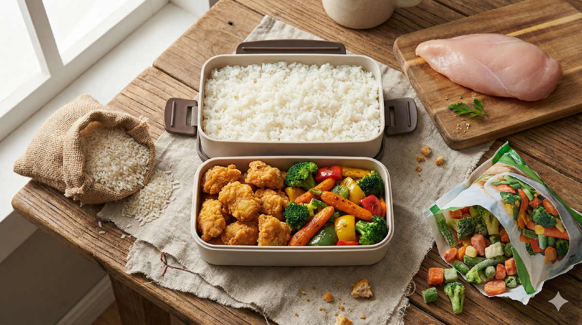 акие обеды можно приготовить вечером за 20–30 минут и взять с собой на работу или учёбу. Они недорогие, сохраняют вкус после разогрева и помогают не тратиться на доставку и кафе. Ланч‑бокс 1. Курица с рисом и овощами Для кого: кому нужен сытный, но не слишком тяжёлый обед в контейнере. Ингредиенты (1 ланч‑бокс): Рис — 60–70 г (сухой). Куриное филе — 120–150 г. Овощи (свежие или замороженные) — 80–100 г. Масло — 1 ст. л. Соль, перец, приправы — по вкусу. Как готовить (кратко): Отвари рис до готовности. Куриное филе нарежь кусочками, обжарь на сковороде с маслом и специями. Добавь овощи, слегка протуши. В контейнер выложи слой риса, сверху курицу с овощами. Примерная стоимость (1 порция): Рис 800–900 г ≈ 90–150 ₽ → 60–70 г ≈ 7–12 ₽. Курица 1 кг ≈ 280–330 ₽ → 120–150 г ≈ 35–50 ₽. Овощи 1 кг ≈ 120–200 ₽ → 80–100 г ≈ 10–20 ₽. Масло, специи ≈ 5–10 ₽. Итого: примерно 60–90 ₽ за 1 ланч‑бокс. Примерная калорийность: по типу «курица с рисом» это около 320–380 ккал на такую порцию (рис, ку