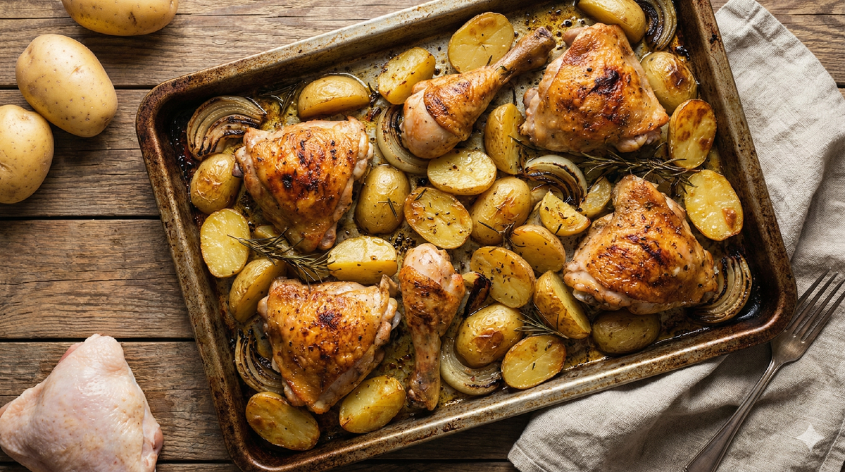 Такой сет удобно делать вечером: всё отправляется в духовку и почти не требует стояния у плиты. Одно блюдо — основное, одно — гарнир, одно — сладкое. Блюдо 1. Курица с картофелем в духовке Ингредиенты (3–4 порции): Курица (бедро/голень/филе) — 600–700 г. Картофель — 600–700 г. Лук — 100 г (1 крупная головка). Масло — 1–2 ст. л. Соль, перец, специи для курицы — по вкусу. Как готовить (кратко): Курицы нарежь кусочками, посоли, приправь специями. Картофель нарежь крупными дольками, лук — полукольцами. На смазанный маслом противень выложи картофель, лук и сверху курицу. Запекай при 180–200 °C около 40–50 минут до румяной корочки, иногда перемешивая. Примерная стоимость (3–4 порции): Курица 600–700 г ≈ 170–230 ₽. Картофель 600–700 г ≈ 25–50 ₽. Лук 100 г ≈ 5–10 ₽. Масло, специи ≈ 15–25 ₽. Итого: примерно 215–315 ₽ за 3–4 порции. Примерная калорийность: курица с картофелем в духовке обычно даёт около 130–170 ккал на 100 г, так что порция 250–300 г — порядка 330–500 ккал. Блюдо 2. Запечён