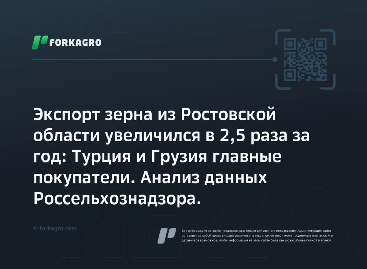 Экспорт зерна из Ростовской области увеличился в 2,5 раза за год: Турция и Грузия главные покупатели. Анализ данных Россельхознадзора. Экспорт зерна и продуктов из Ростовской области в ноябре 2025 года увеличился в 2,5 раза, составив 655 тыс. тонн. Турция и Грузия стали основными импортерами, прошлом году в топ-3 были Албания, Тунис и Иран. Экспорт сельхозпродукции за 10 месяцев уменьшился на треть, составив около 10 млн тонн. Поставки включали пшеницу, подсолнечник, кукурузу и другие культуры. Перейти к источнику