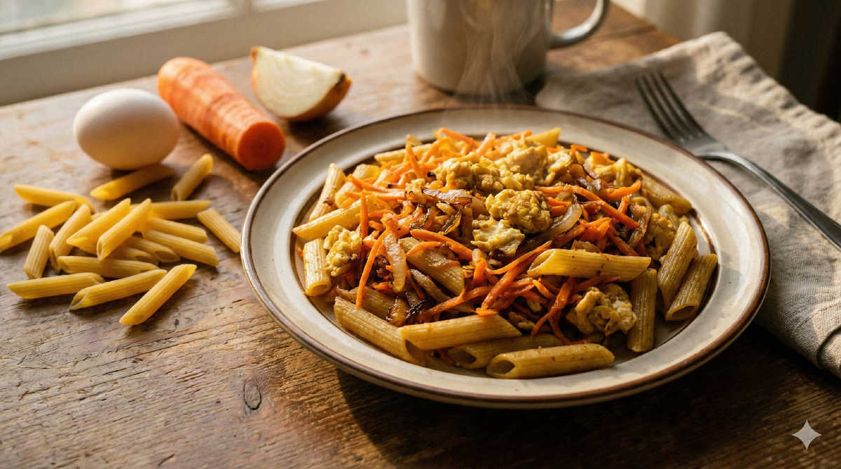 Ингредиенты (1–2 порции) Макароны — 80 г (сухие). Яйца — 2 шт. Морковь — 60–80 г (1 небольшая). Лук — 40–50 г (½ средней головки). Масло растительное — 1 ст. л. Соль, перец, любые недорогие специи — по вкусу. Как готовить: Подготовь продукты.