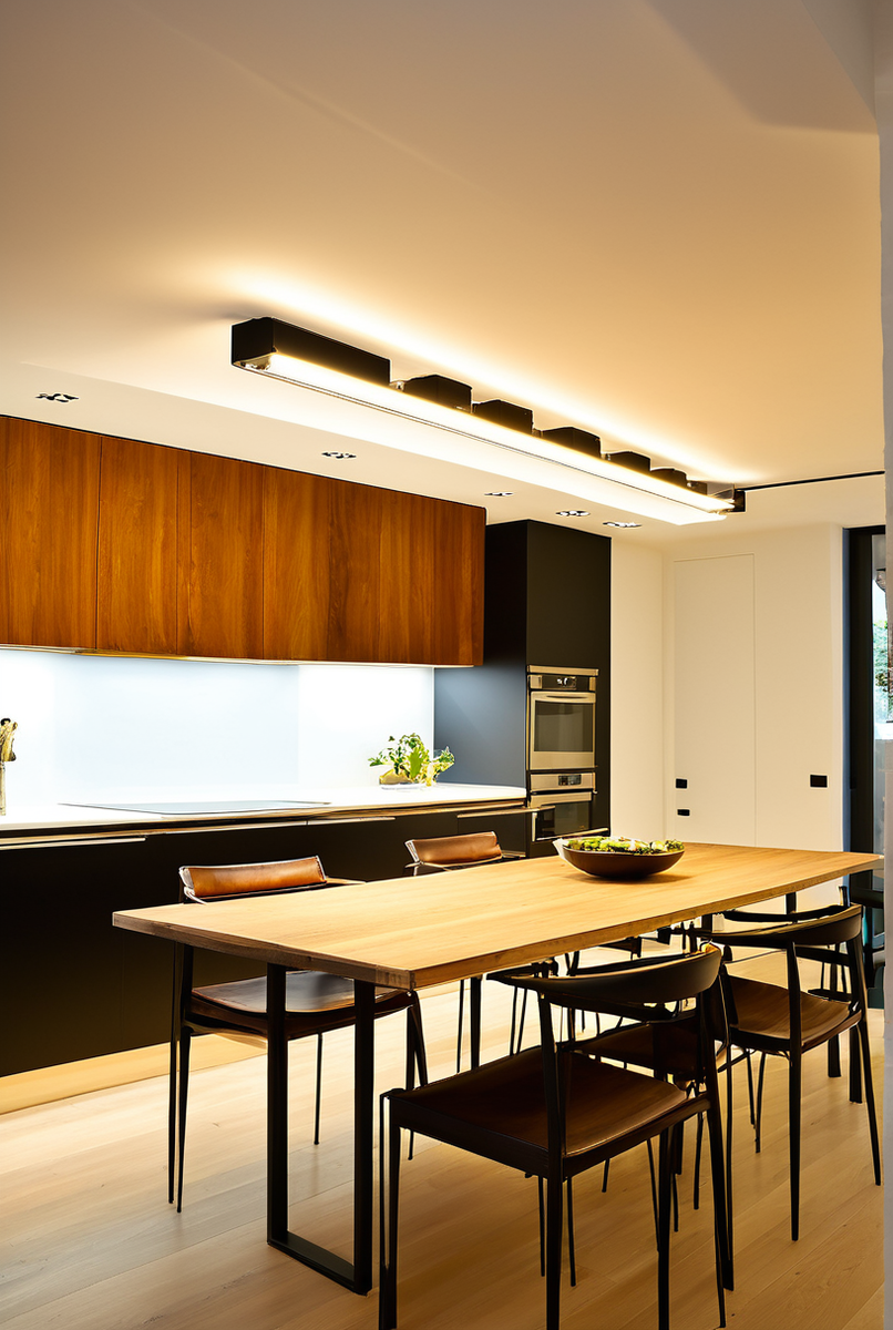 Главное преимущество — это выбор светильников. Разнообразные трековые светильники LED позволяют реализовать любой сценарий. Поворотный светильник незаменим для акцентов, а линейный светильник и световые линии создают общее равномерное освещение. Для зонирования над столом или барной стойкой используется подвес. Ключевая возможность — это гибкое управление светом. Технология диммирования позволяет плавно изменять яркость, адаптируя атмосферу под настроение. Важно заранее предусмотреть совместимый блок питания и диммер. Такой подход к освещению гостиной или кухни превращает свет в динамичный элемент дизайна, который меняется вместе с вами.
