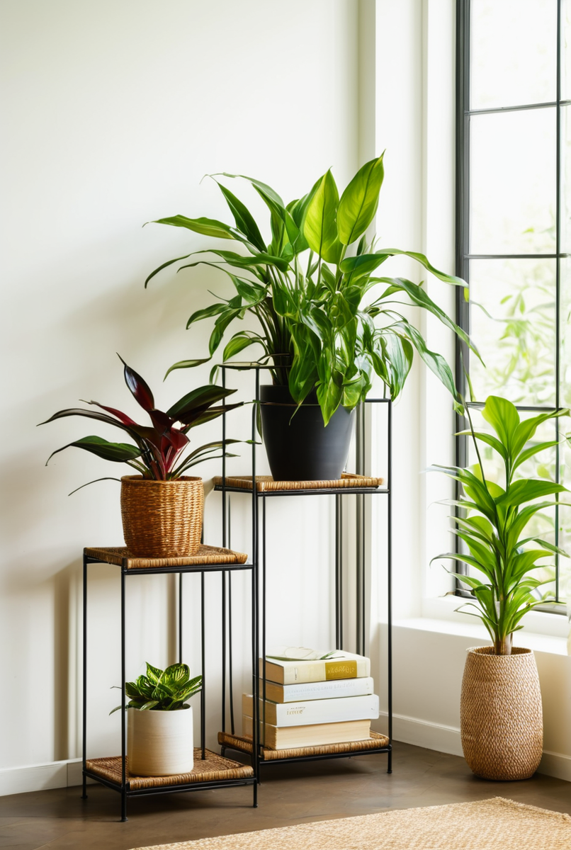 Высокая многоуровневая полка или несколько подставок в ряд — отличный инструмент для зонирования пространства. Они создают легкую перегородку, не перегружая интерьер, что идеально для фитодизайна квартиры.