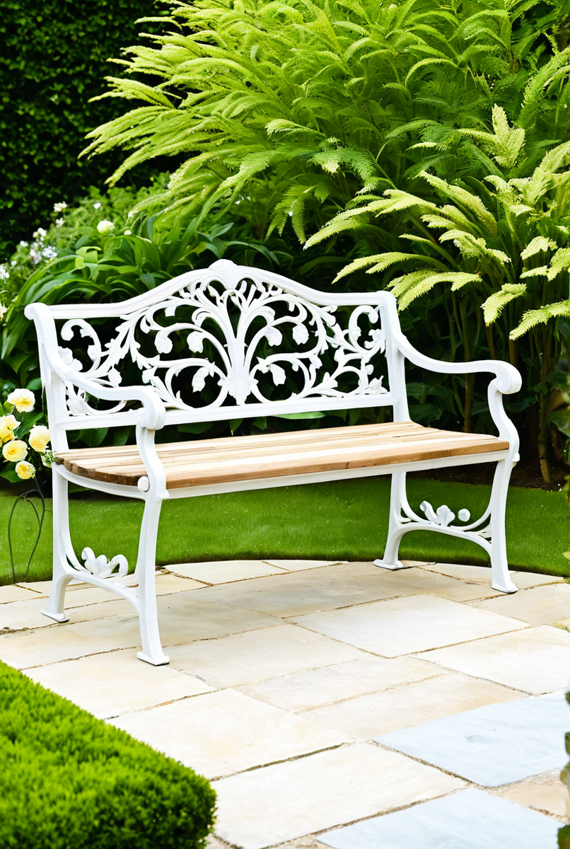 - Классический стиль: изящная кованая или чугунная лавочка с витыми элементами.