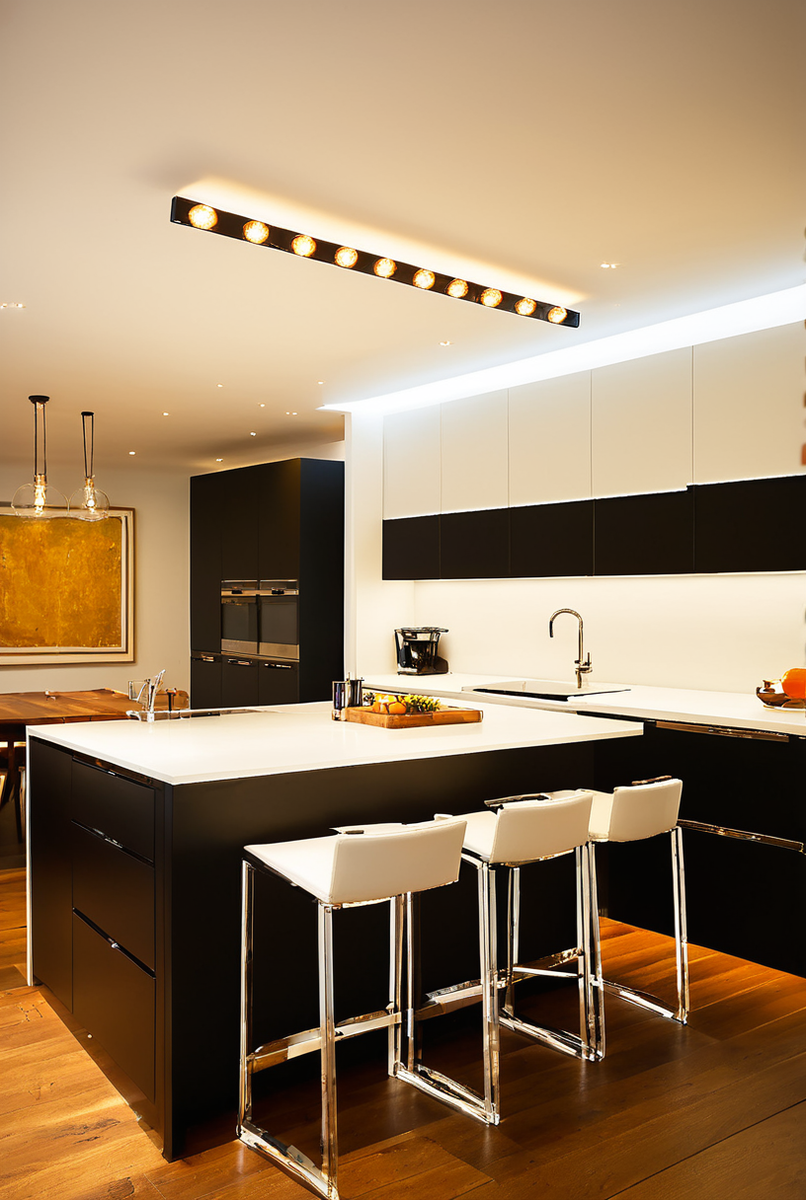 - Лофт и хай-тек: здесь уместны металлические или черные модели на планке, подчеркивающие технологичность. Идеальны как основное освещение кухни или споты в гостиной.