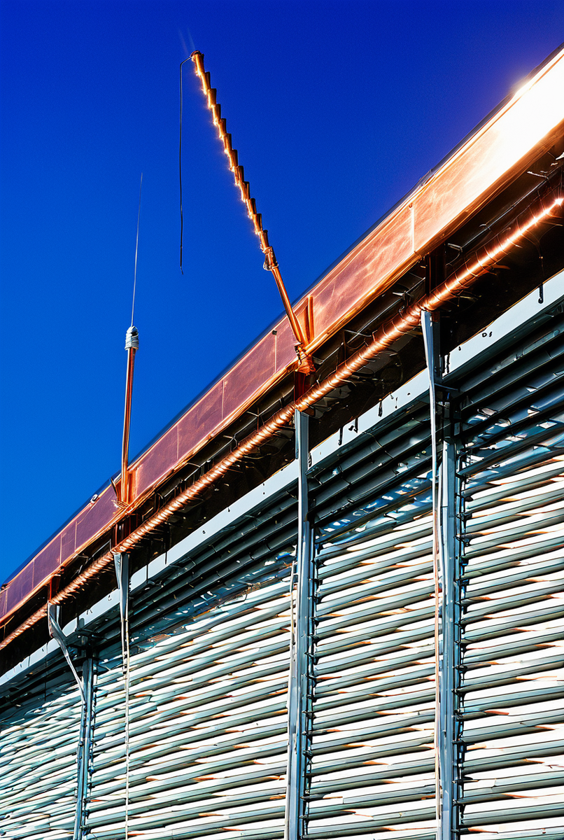 Для крепления используется пластиковый держатель, устойчивый к УФ-излучению, а все сегменты соединяются через надежный зажим для токоотвода. На обширных плоских крышах эффективна молниеприемная сетка, которая также формируется из проводника.