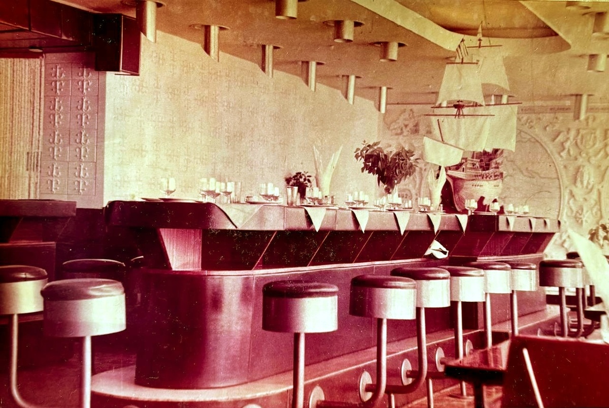 Рекламный проспект «Фирменные блюда и изделия омских кулинаров и кондитеров», изданный в 1984 году Управлением общественного питания Омского облисполкома, запечатлел облик некоторых омских баров, кафе и ресторанов. Ведь привлекали художников или художественные комбинаты даже не в "центровые" заведения. Видим гипсовое литье, рисованные панно, чеканку, деревянную резьбу. Классная стильная мебель дизайна еще "оттепели" 1960-ых. Ничего не сохранилось. Но недавно в Москве видел в Музее декоративно-прикладного искусства "капсулу времени" в виде советской комнаты 1960-1980х годов. Что удалось опознать на фото: ✔️Кафе «Фрегат» с географической картой и макетом корабля находилось на улице Заозерной. Любопытно, что барные стулья здесь были намертво прикручены к стойке ✔️Кафе «Океан» с изображением Нептуна работало на месте нынешних заведений в «Топазе» ✔️Кафе «Молодежное» действовало на улице Добровольского ✔️А кафе «Колос» располагалось на улице Бетховена ✔️На черно-белом фото — интерьер