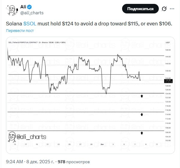 Solana должна удержать уровень в $124, чтобы избежать падения к $115 или даже к $106