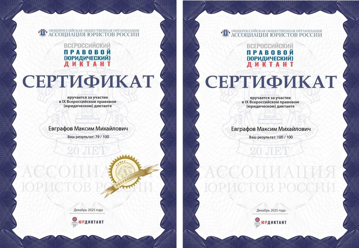 ЮРДИКТАНТ что это? Кто не знает сейчас всё расскажу 👍 С 3 по 12 декабря 2025 г. проходит ежегодный Всероссийский правовой (юридический) диктант — масштабный просветительский проект в форме добровольного тестирования, направленный на проверку и повышение уровня правовой грамотности граждан. Организатор диктанта — Ассоциация юристов России при поддержке ряда государственных и общественных организаций. 🗓 Так как я являюсь членом Ассоциация решил поучаствовать, чтобы проверить уровень своей юридической грамотности. По итогам теста мои результаты оказались такими: Номинация «Профи»: 79 баллов, «Базовый»: 100 баллов ‼️ Результат хороший, НО меня немного разочаровало распределение вопросов: значительная часть касалась военного права, что оказалось неожиданностью и повлияло на итоговую оценку. 😞 Несмотря на частичное недовольство тематическим составом вопросов, сам факт участия и объективная оценка собственных юридических знаний ПОМОГЛИ лучше осознать направления дальнейшего развития