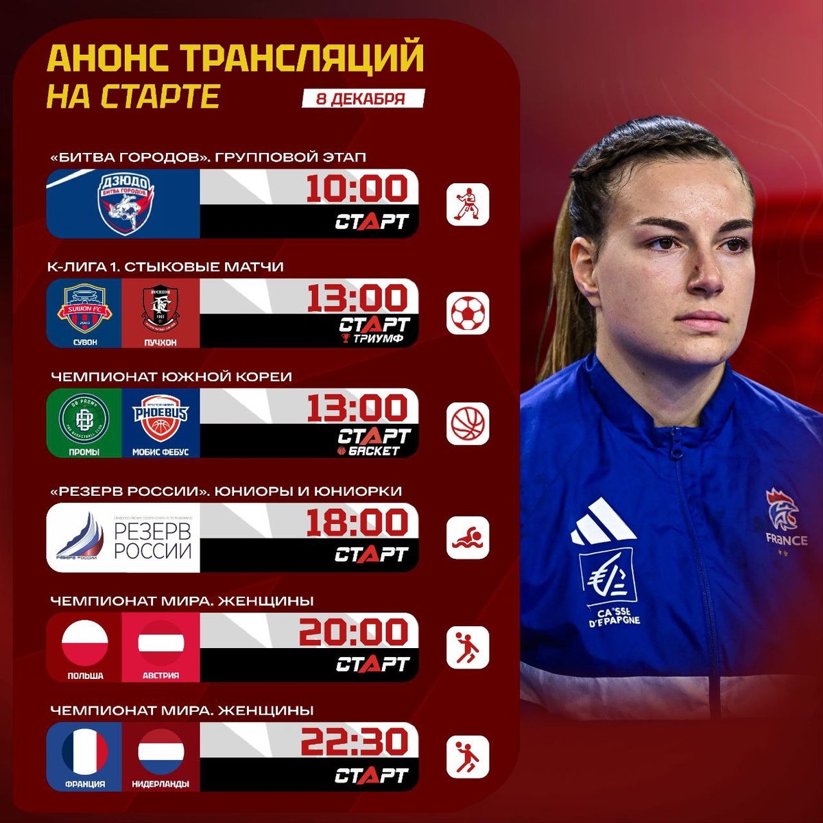 📺🍿 Разнообразие спорта в понедельник на TVSTART.RU! Начинаем неделю в Сириусе, где проходит крупнейший юниорский турнир по дзюдо, «Битва городов». Далее заглянем в Южную Корею. Там определится последний участник будущего сезона К-Лиги 1, ну и баскетбол тоже посмотрим. На вечер запланировано юниорское плавание и два матча гандбольного ЧМ. Действующие победители турнира, француженки, разыграют первое место в группе с голландками. Оставайтесь весь день на платформе TVSTART.RU 🖥 Подписывайся на ТВ СТАРТ в MAX📲