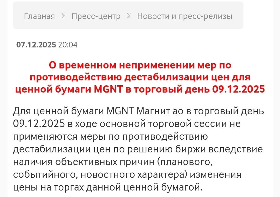 Доброе утро 🌄 У меня вопрос, И это означает, что #MGNT Магниту всё можно 9 числа? Новость на сайте Мосбиржи. UPD 11:33 - новость по ходу удалили с сайта Мосбиржи 🤡 🎪 Если Магнит растёт 9 числа утром более, чем на 10%, то никаких мер по противодействию такой дестабилизации цены принимать не будут? Если вниз 10%, кстати, тоже самое. 😳🤷♂️ Мосбиржа вот что пишет. Лучше бы, конечно, мажоритарий и менеджмент озаботились последние 2 года мерами по устранению стабильного, жесточайшего тренда вниз 🤦♂️ Цена выходит вверх на +4,5% выше дневной EMA55 за долгое время. Если есть объем, а цена растёт - скорее всего инсайдеры уже в курсе. Ситуация опасная, можно купить со стопом на лой дня, а можно купить другие акции (также со стопами/отменами) и не играть в такие рулетки с магнитиками. Но жадность участников всё равно победит, так что скорее всего прямо сейчас происходит слом нисходящего тренда, то есть разворот цены. 👉 А в целом уже бодрое начало недели - Моди ралли же 👍