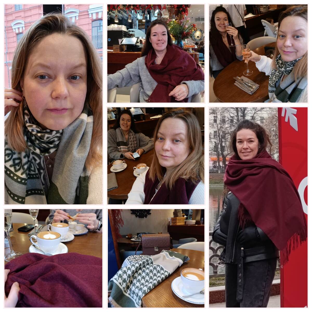 Я всегда выбираю палантины так, чтобы они подчёркивали глаза. Если аксессуар их «тушит» — значит, намудрили с палитрой или контрастностью. Благо, выбор сейчас огромный. Надо просто знать, как выбирать. Для наглядности я в конце завтрака накинула свой палантин на Наташу. И видите? У Наташи пропал цвет лица, а у меня, в ее варианте, акцент ушел с глаз. В наших же «родных» сочетаниях всё было идеально.