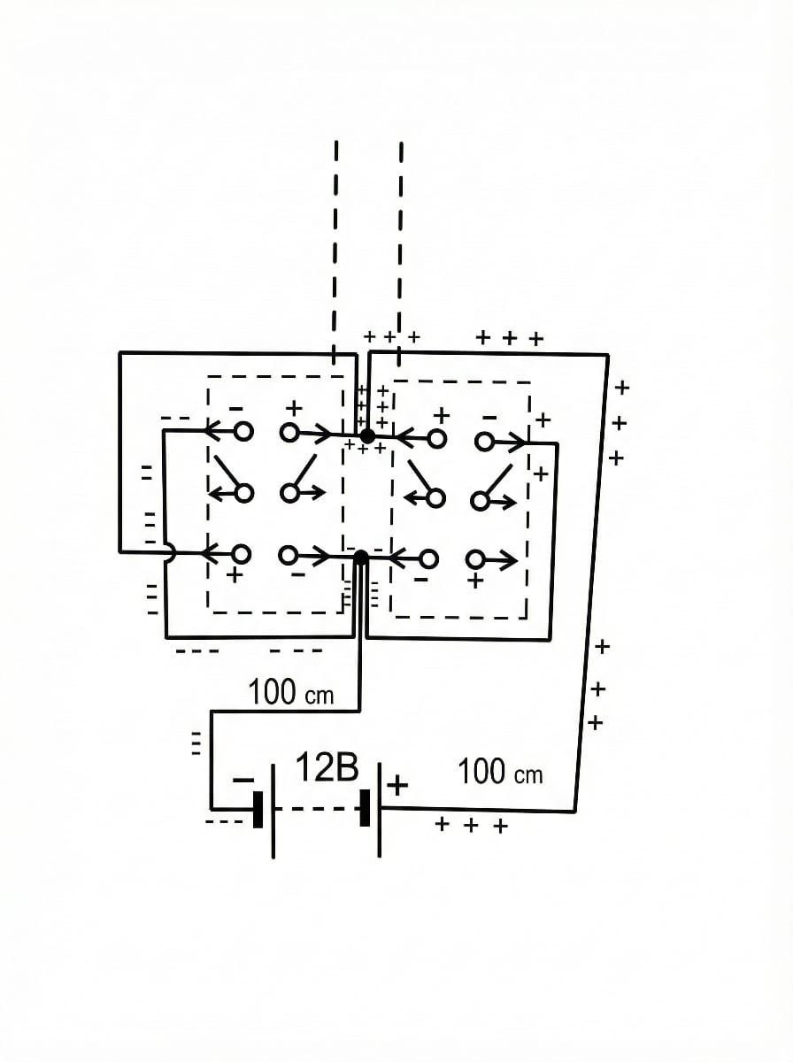Представь, что эта картинка — это карта для маленьких невидимых человечков, которых зовут «Электричество» ⚡️. Они живут в батарейке и очень любят бегать по дорожкам. Давай посмотрим, что здесь нарисовано: Батарейка внизу (12В) 🔋 Это домик, где живут человечки. У них есть две команды: команда Плюс (+) и команда Минус (-). Они всегда хотят бежать друг к другу. Черные линии 〰️ Это дороги или горки, по которым бегут человечки. На картинке написано «100 см» — это значит, что дороги очень длинные, целый метр! Как от пола до твоего плеча. Два больших квадрата в центре 🔲🔲 Это самое интересное! Это «Волшебный перекресток». Видишь там стрелочки внутри? Это ворота. Они могут открываться и закрываться.Когда ворота открыты в одну сторону — ток бежит прямо, и, например, машинка едет вперед 🏎️. А если щелкнуть переключателем, ворота перекидываются, человечки меняются местами (плюс бежит туда, где был минус), и машинка едет назад! 🔙 Итог: Эта схема нужна, чтобы сделать пульт управления дл